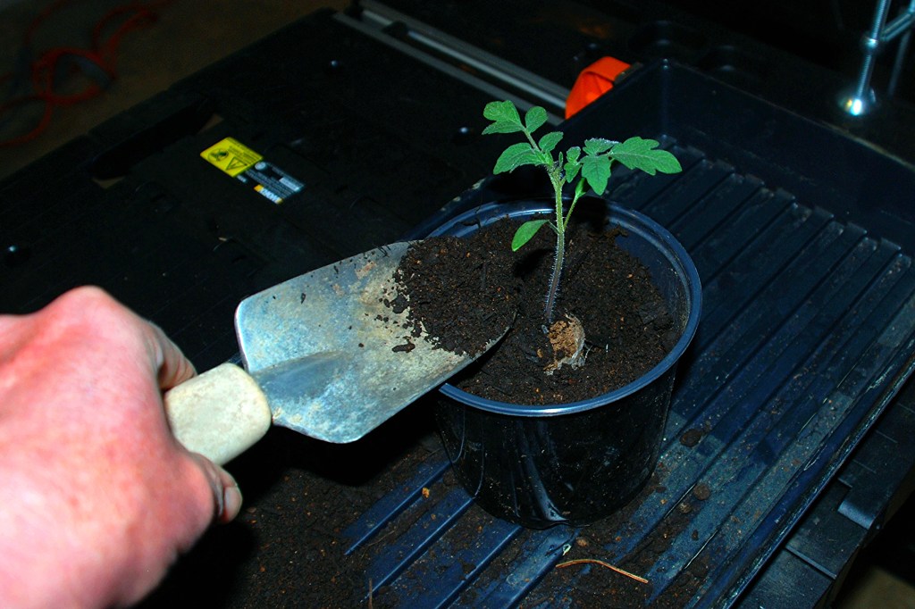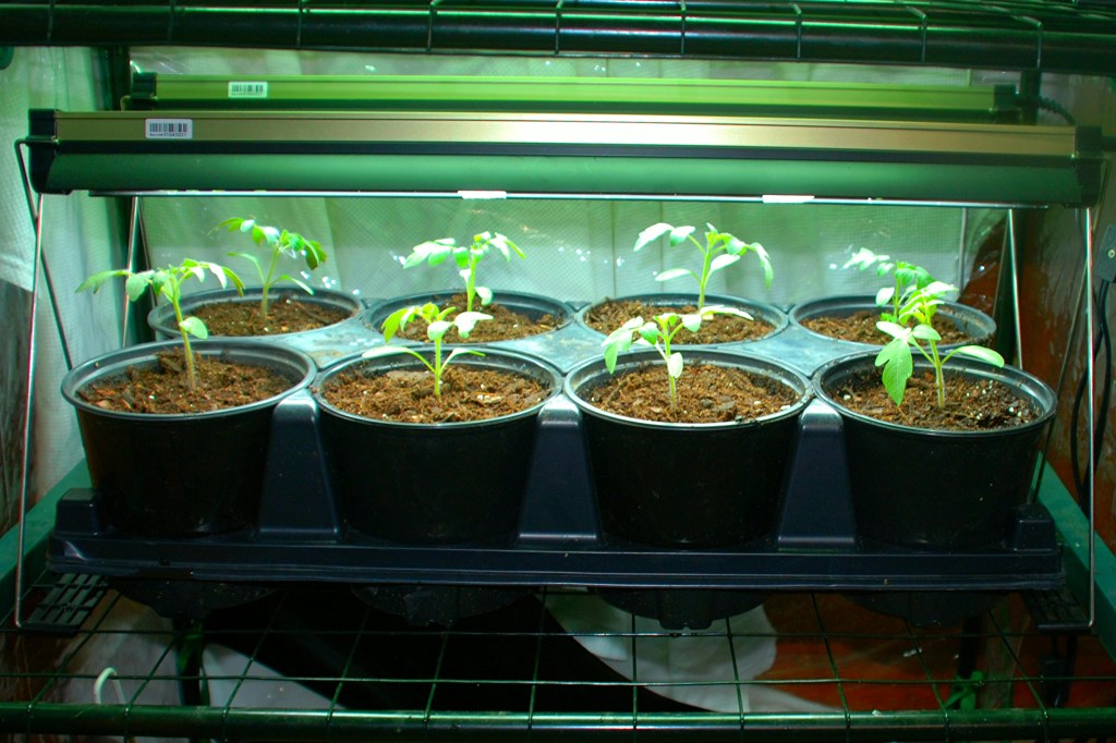 This tray of cherry tomato seedlings was transplanted to 6-inch pots to continue growing.