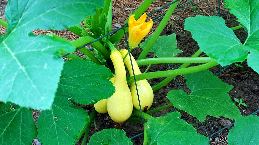 We planted our fruit vegetables in this 10-foot by 10-foot section of our garden (two tomatoes, three okras, three squashes, and three cucumbers).