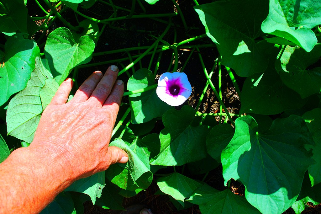 We found this little guy snuggled among the sweet potato vines. This is our first attempt to grow sweet potatoes and thought it was a morning glory flower. After a little online research, we learn that it is a sweet potato blossom and sweet potatoes are in the morning glory family.